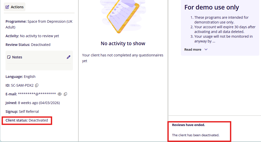 Within a client's review panel, the coach is clearly informed that the client is deactivated.